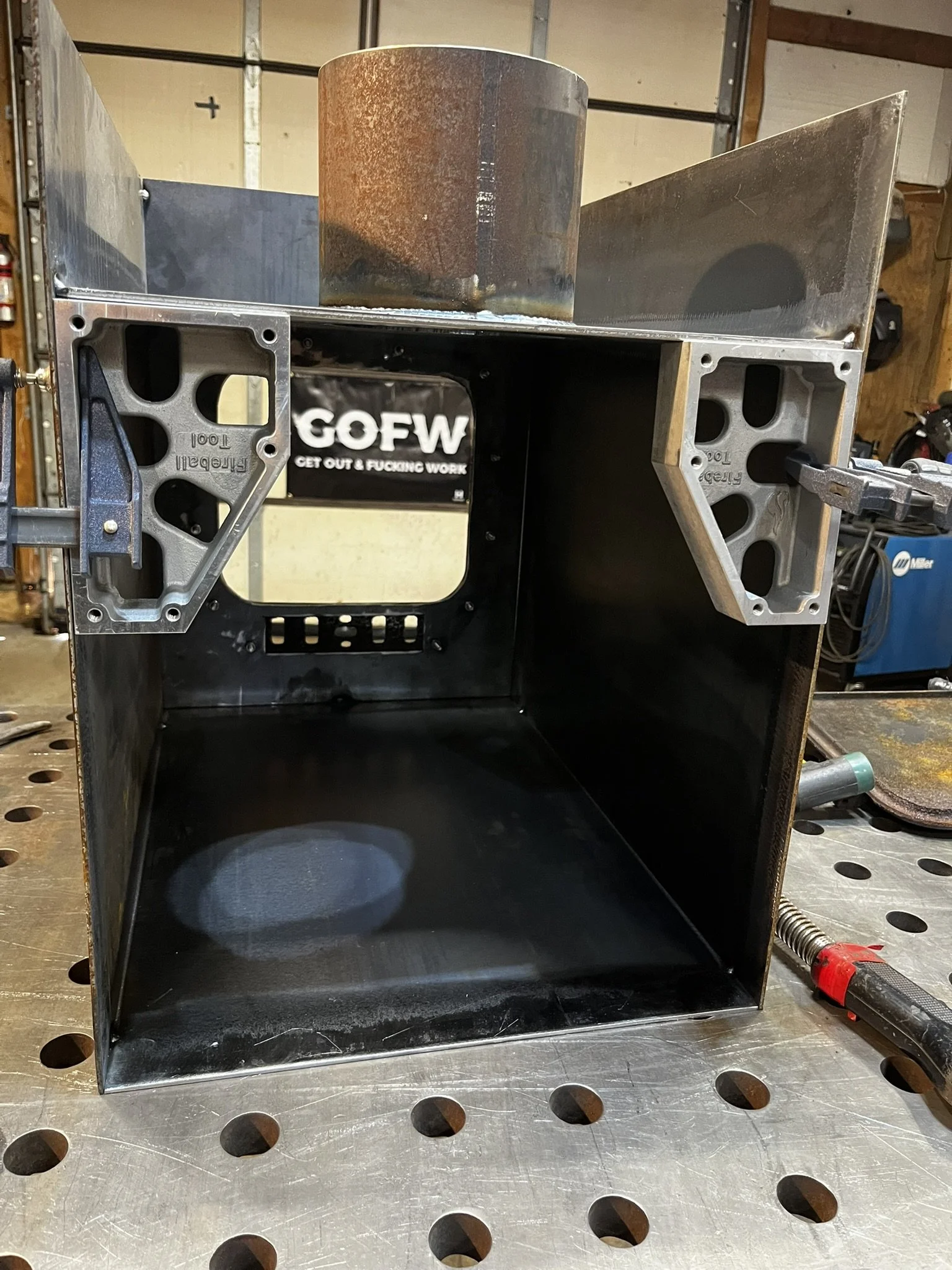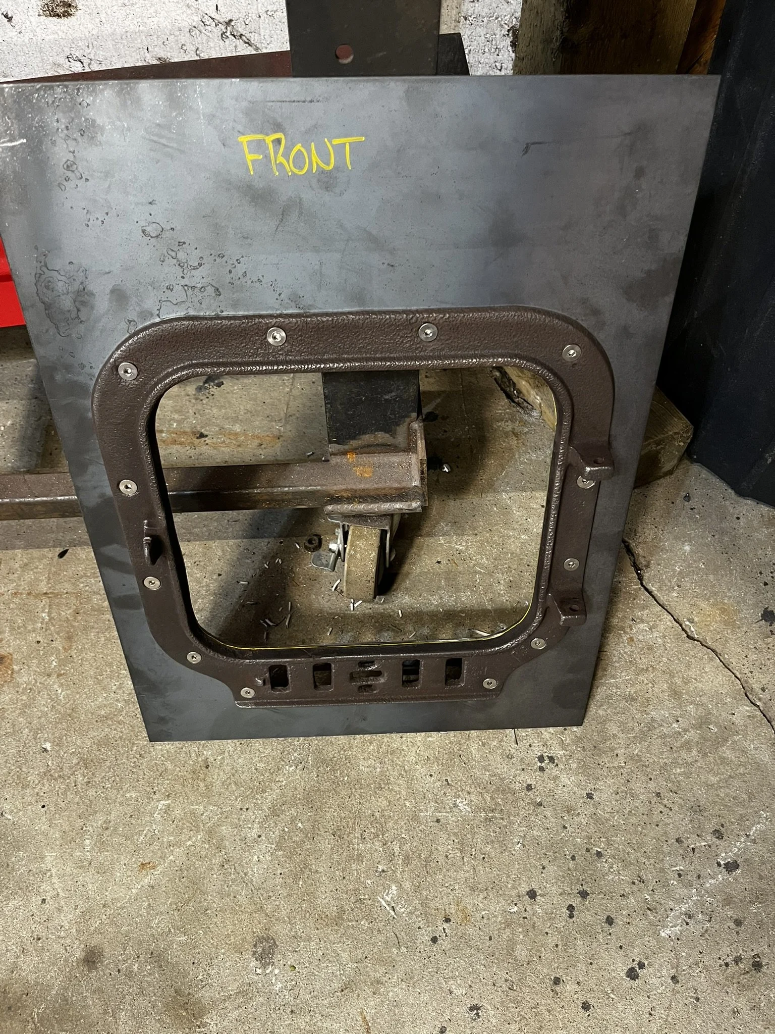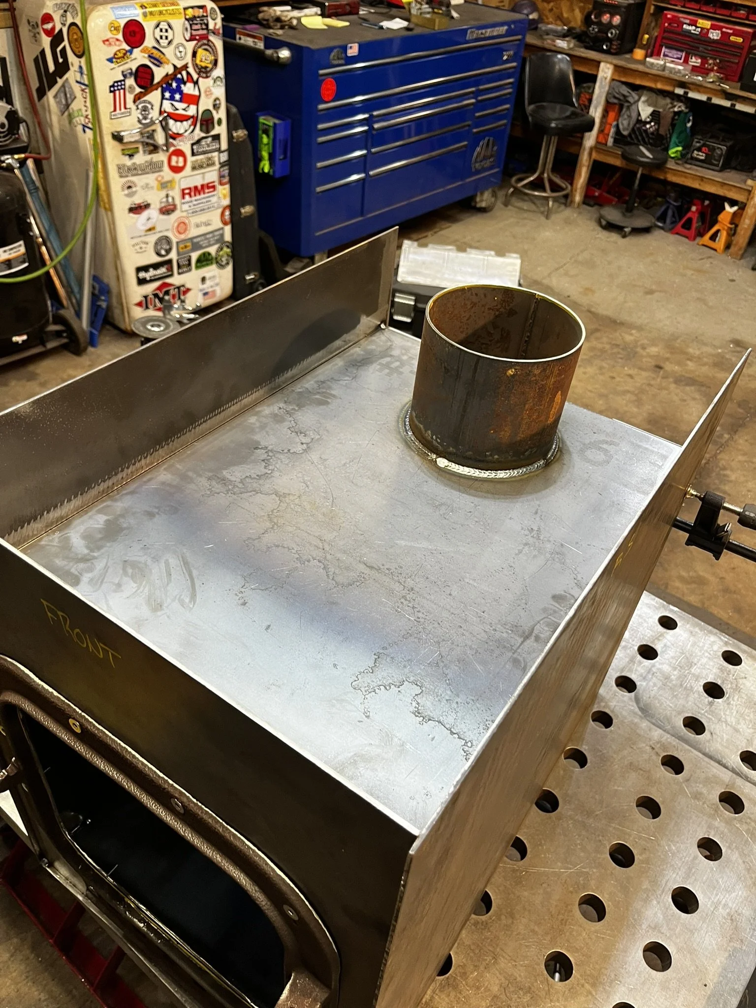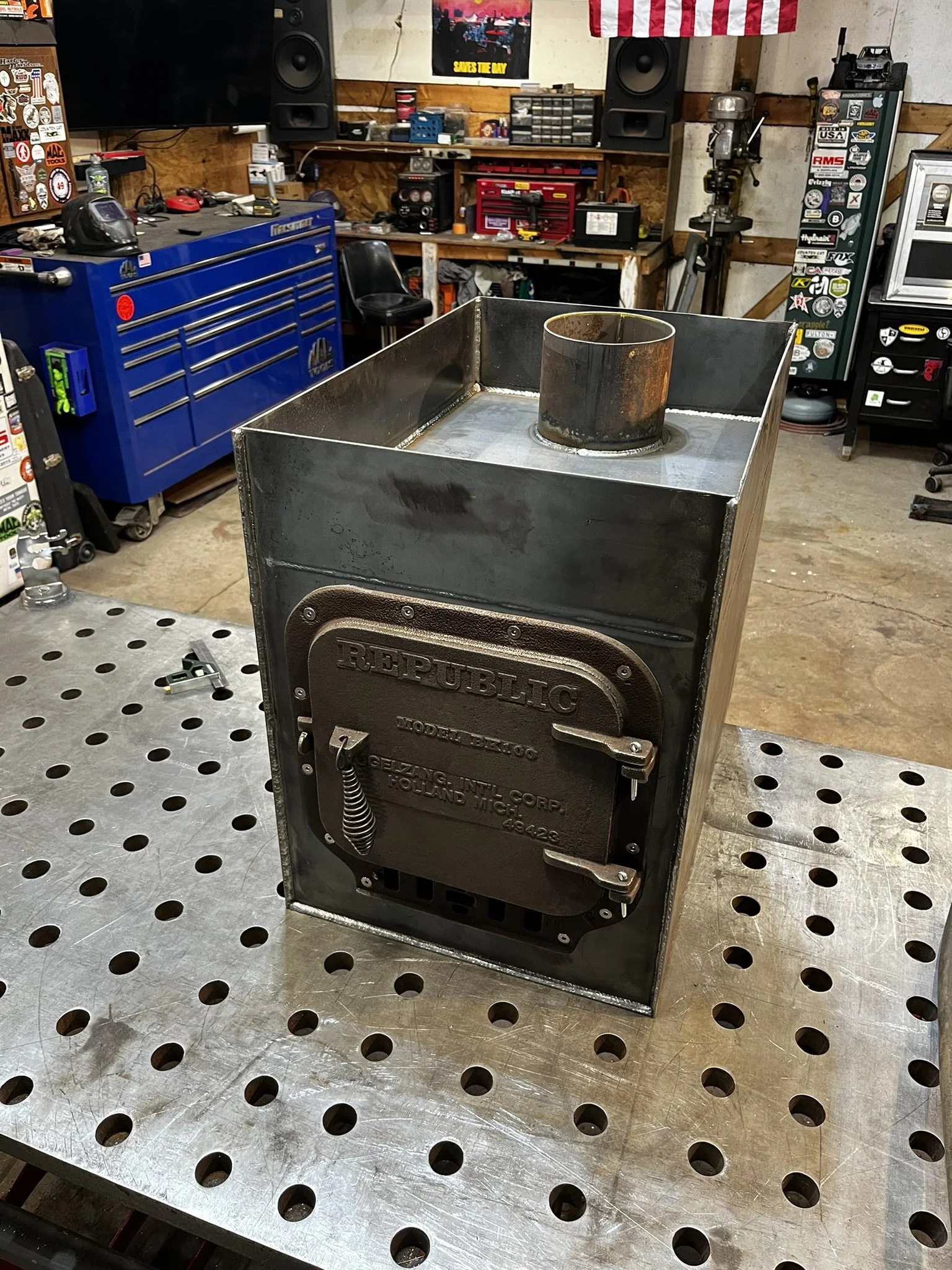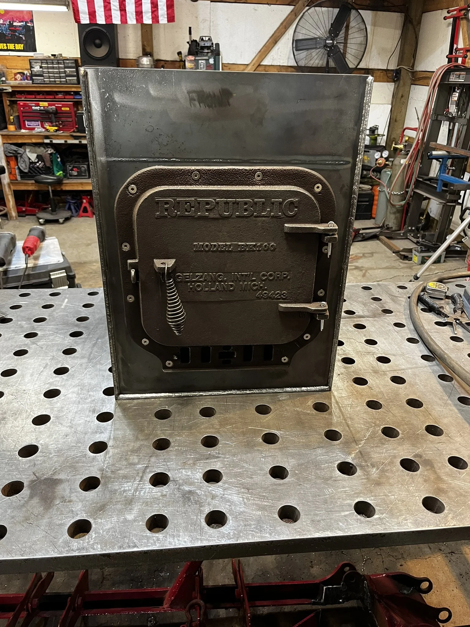 This sauna stove was built by copying the original design. The original stove had long since served its time and was in need of being replaced. The new box was cut and fabricated for 3/16" Mild Steel. This project was welded out using .035 ER 70S-6 wire and the GMAW process. The original cast steel door and draft window were resurfaced and coated with boiled linseed oil to help prevent further rusting . To finish the project off the door was secured with stainless steel hardware and stainless steel cotter pins.